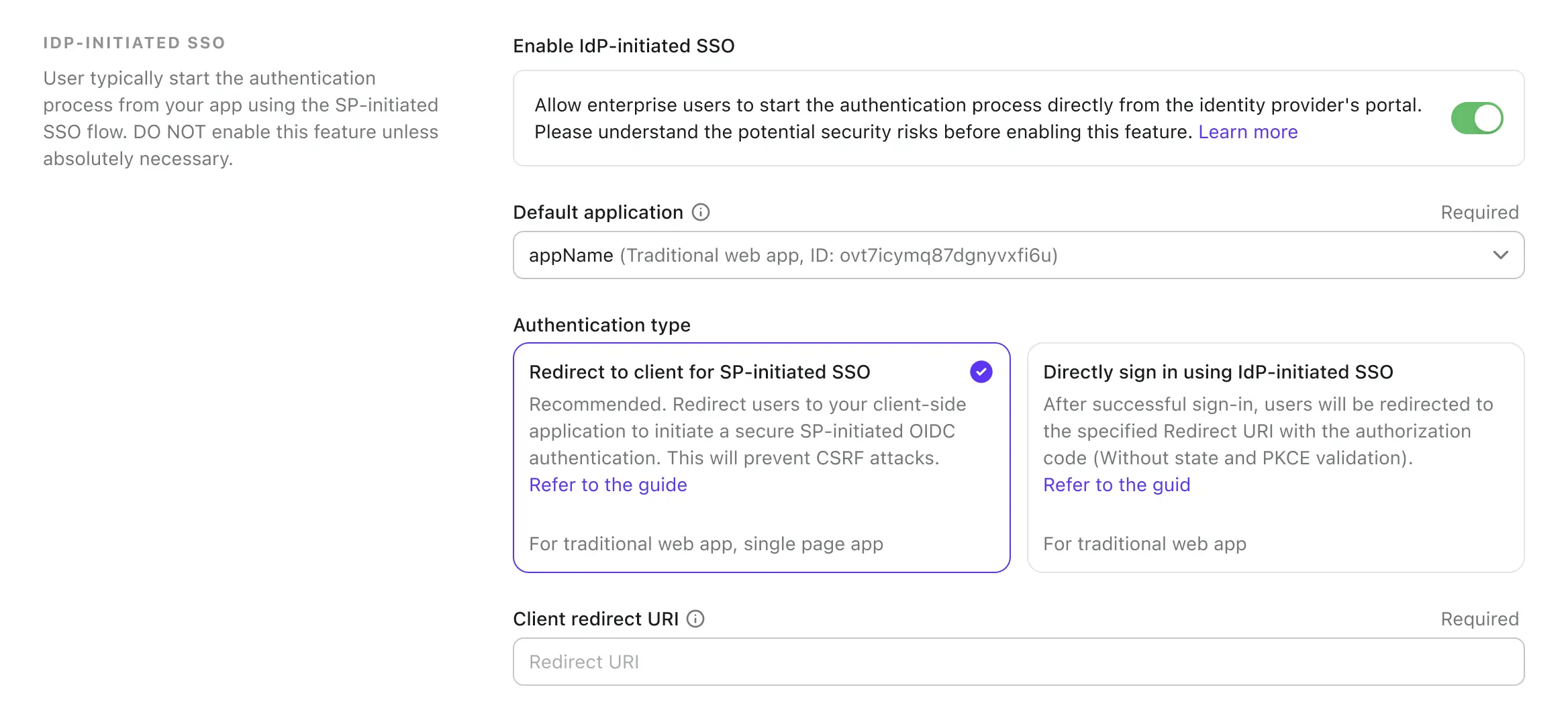 Unlike SP-initiated SSO, where the authentication flow starts from the SP, IdP-initiated SSO requires a client side SP application to redirect users after the authentication process. You can select the SP application from the list of registered applications in the Default application dropdown.